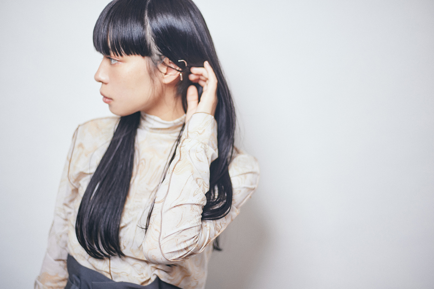 ワイドバングが印象的なスタイル。